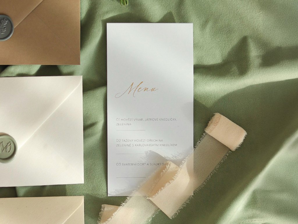 Minimalistické svatební menu s dominantním motivem oblouku a elegantním prvkem ve zlaté nebo stříbrné barvě. Připravím pro vás menu na svatební stůl ve stejném stylu jako svatební oznámení a ostatní svatební tiskoviny, aby celý koncept působil jednotně a čistě.
