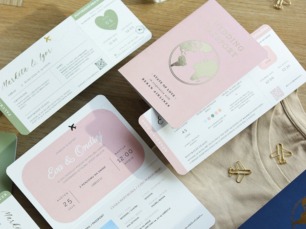 Svatební oznámení ve stylu cestovního pasu, které symbolicky otevře novou kapitolu vašeho společného života. Originální design inspirovaný pasem dodá oznámení osobitost a jemný cestovatelský nádech.